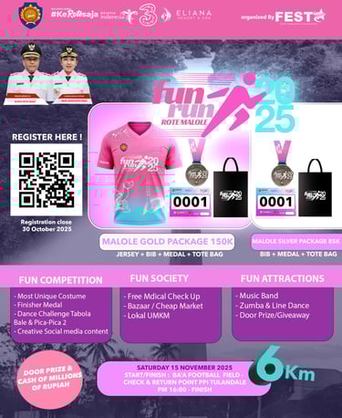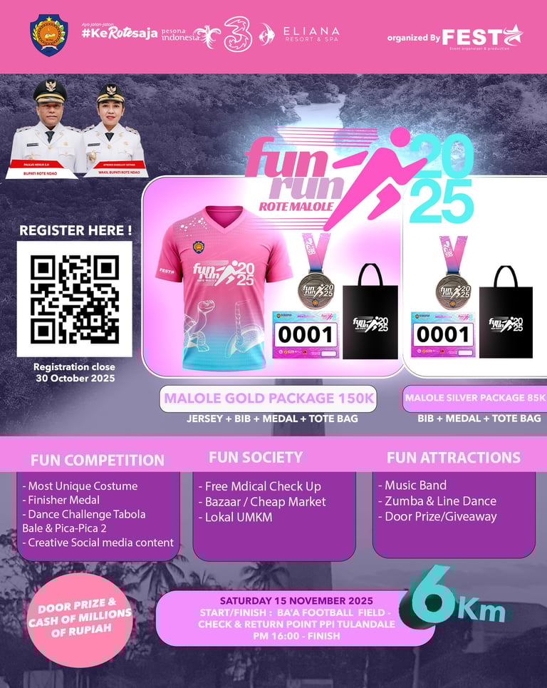 Kegiatan yang bertajuk “Rote Malole Fun Run 2025” ini menjadi langkah baru bagi Rote Ndao dalam memperkenalkan potensi wisata alam, budaya, dan keramahtamahan masyarakat Rote kepada wisatawan lokal maupun mancanegara.